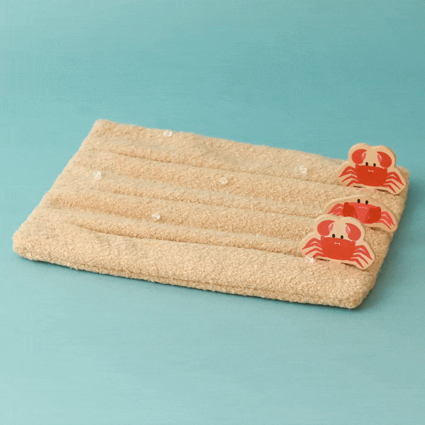 砂浜をカニが移動する風景がフラットポーチになりました。ポーチを開閉するたびに、いつでもカニを横歩きさせることができます。