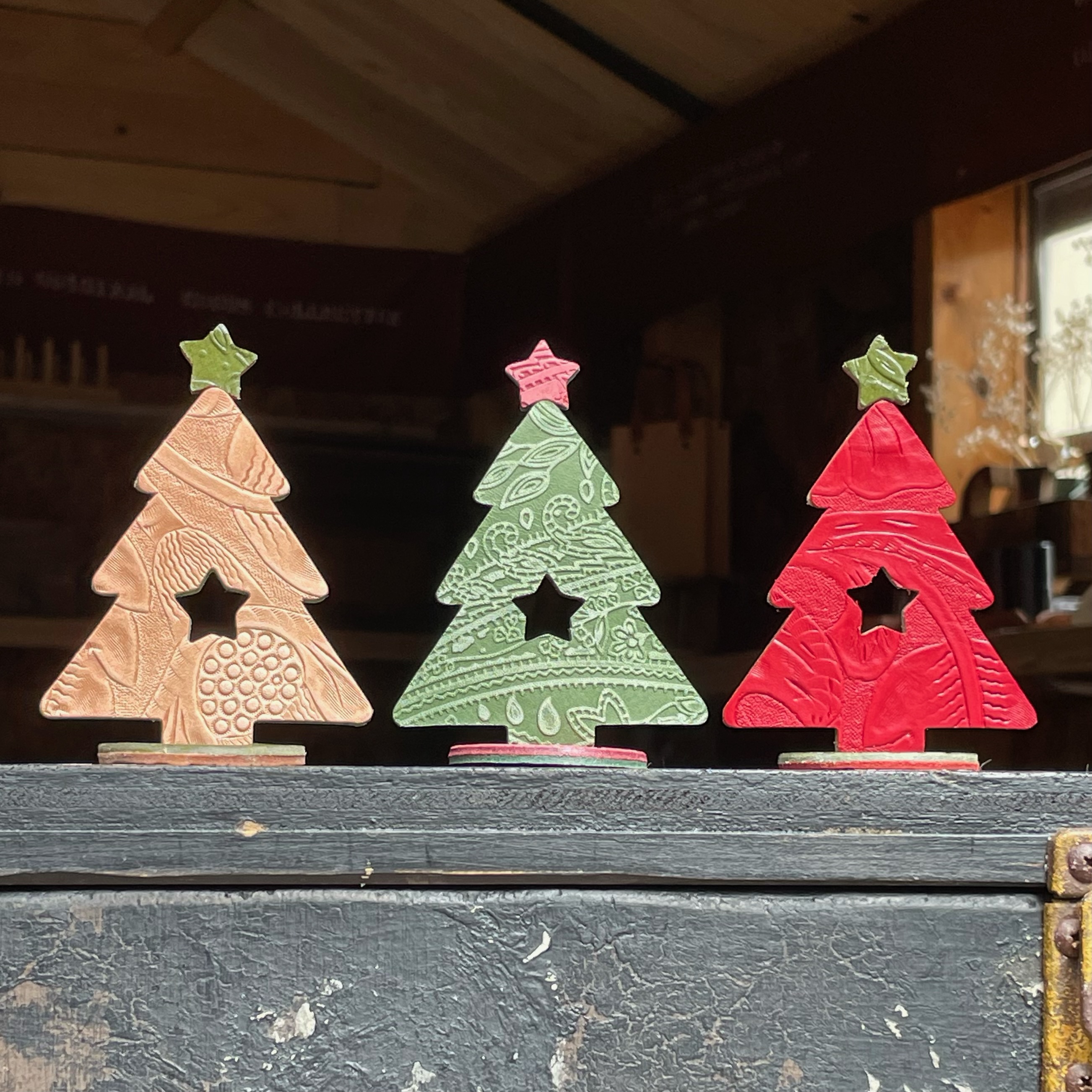 高さ8㎝のミニサイズ!お部屋の片隅に置けるサイズです。2種類の革を選んで張り合わせ、ツリーや星の型を抜き、土台を作って完成です。