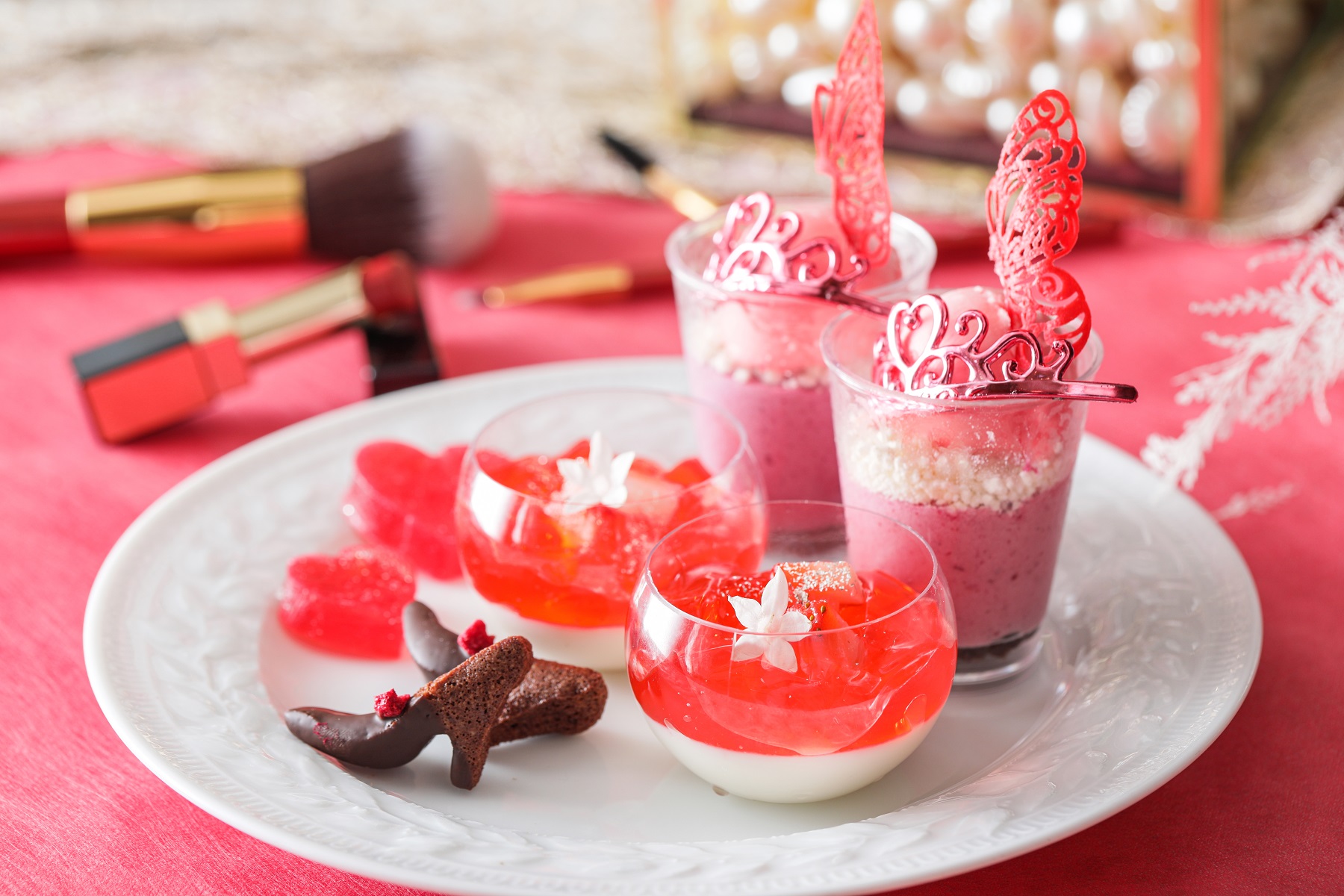 メインのスイーツスタンドは、主にロイヤルレッドで統一し、大人かわいい女性を表現するため“ティアラやバッグ、ハイヒール、ハート、蝶々”など、細部まで趣向を凝らしたスイーツに仕上げました。また、“美容”に良いとされている、フルーツビネガーや高カカオのチョコレート、ピスタチオ、ビーツなどを使用しており、女性にとっては嬉しいポイントに。
