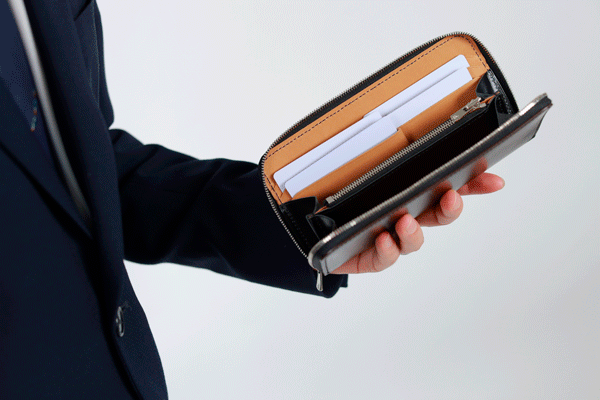 従来のラウンドジップ長財布はお札の角が折れやすいという欠点がありました。